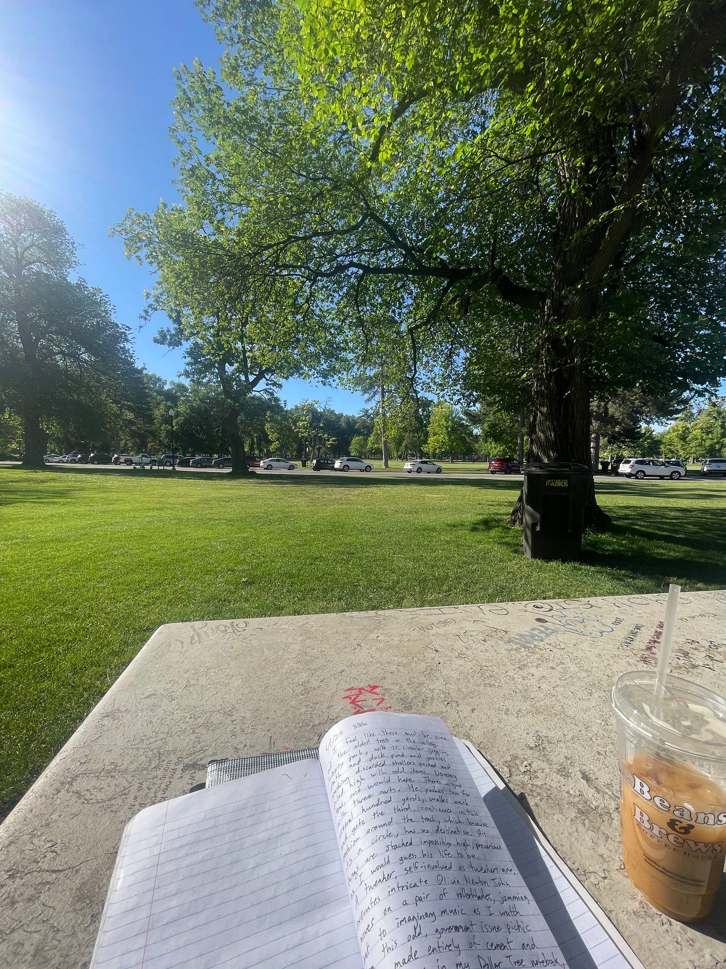 There’s pain that comes with the awareness that my bearings run perpendicular to everything happening in this place at this early hour, echoed in the way I’ve situated myself relative to the park’s circular running/jogging/biking path. My accoutrements: cigarettes and iced Americano. Smokers are a dying breed. It’s not cool anymore. Everyone vapes now. Smoking is not allowed in the park. I figure I’m far enough off the running path, so I pretend to not know this and do it anyway.